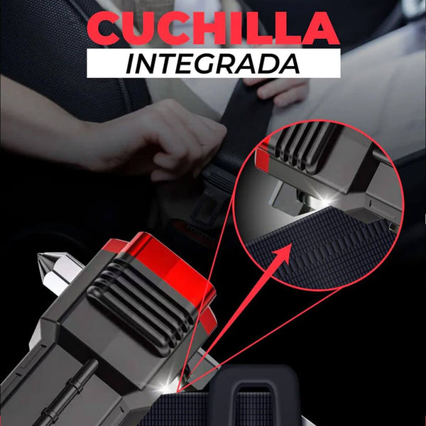 Está diseñado con una punta de acero reforzado para quebrar fácilmente el vidrio templado de las ventanas laterales de los vehículos con un solo golpe. (No se recomienda para el parabrisas delantero, que es laminado).